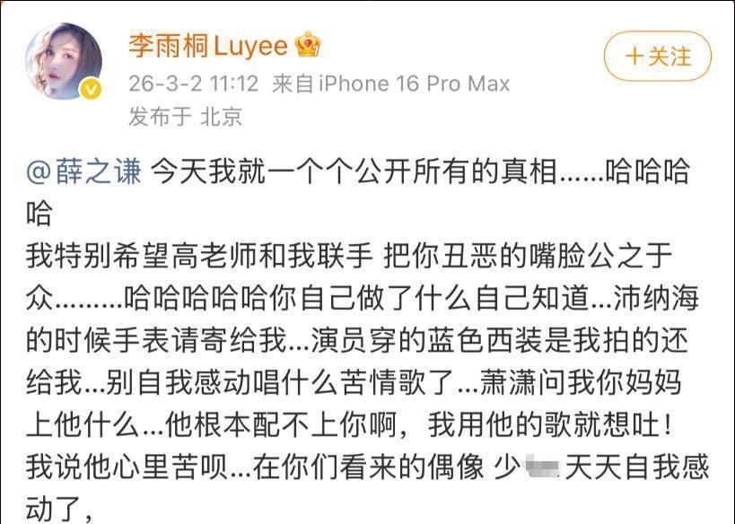 不过在感情方面,他确实经历了一次几乎被证实的感情崩塌事件。3月2日那天,李雨桐连续发了几条动态,虽然内容有点跳,有点乱,但说薛的事基本没跑。